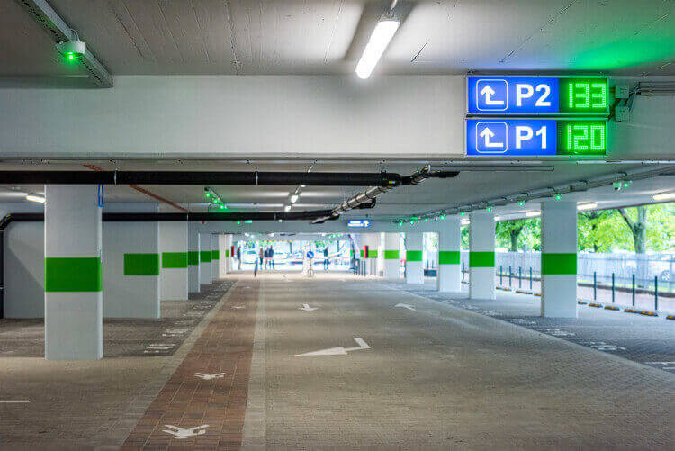 A parkolóházba behajtva ott lehetséges a parkolás, ahol a parkolóhely feletti lámpa zölden világít. Az első emeletről és a tetőtéri parkolóból gyalogosan a lépcsőházakban lehet a földszintre jutni.